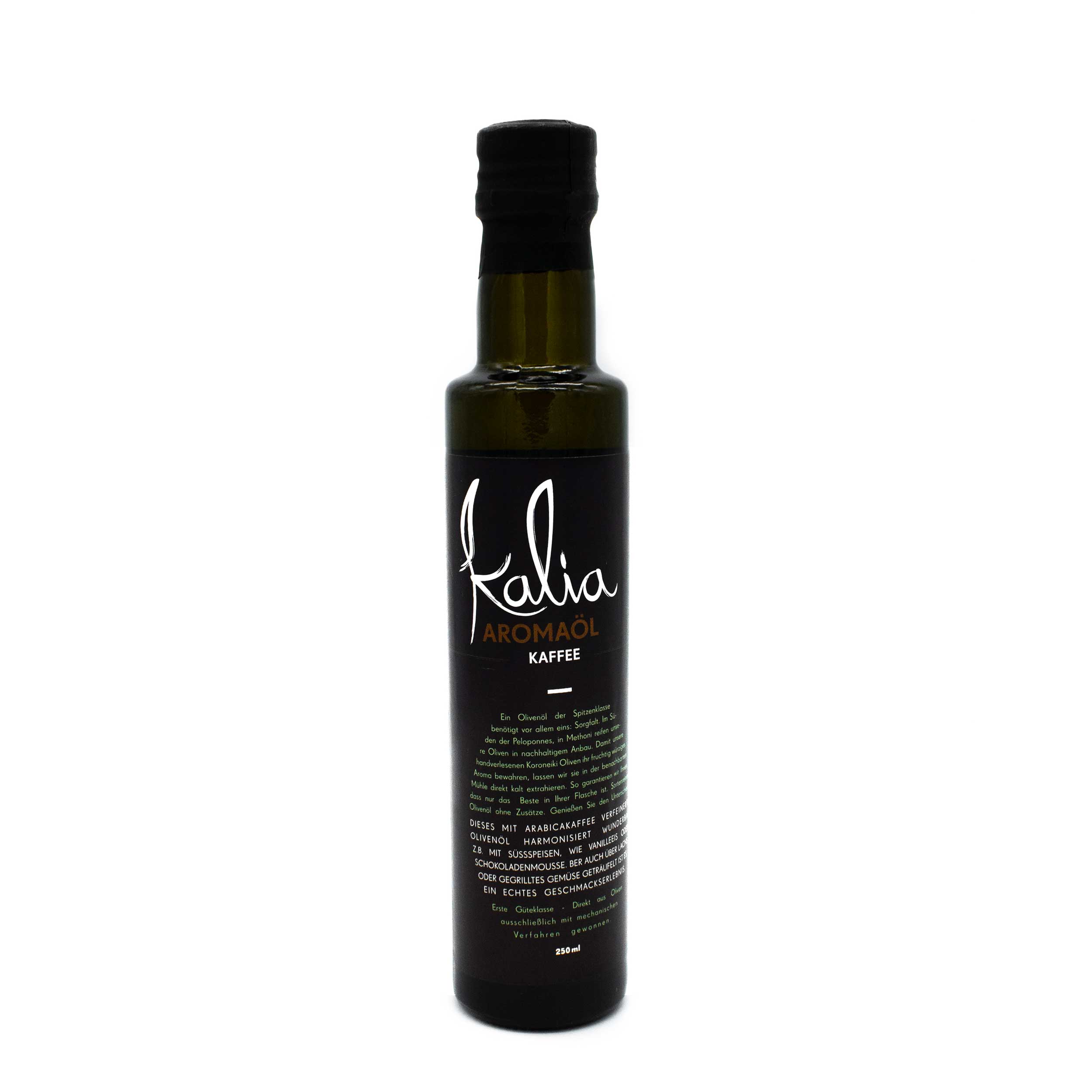Unser Kaffee Olivenöl Nativ Extra verbindet hochwertiges Kalia Olivenöl mit dem intensiven Aroma von frisch gemahlenem Arabica Kaffee. Diese besondere Kombination vereint die fruchtigen Noten eines hochwertigen Olivenöls mit den tiefen, leicht herben Aromen von Kaffee und schafft so ein außergewöhnliches Geschmackserlebnis.